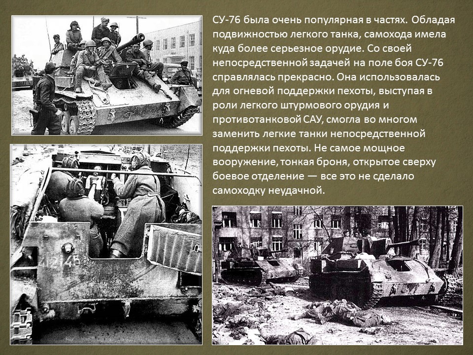 Прошло больше года с начала войны, прежде чем в Красную Армию начали поступать первые самоходки. На всех этапах боя самоходная артиллерия играла важную роль в поддержке действий войск. При стремительном наступлении она совместно с танками неотступно преследовала противника, уничтожая его живую силу и технику. Обладая высокой подвижностью и мощной броней, равной современным танкам, самоходная артиллерия зарекомендовала себя как артиллерия непосредственного сопровождения танков и пехоты. Кроме того, самоходная артиллерия явилась эффективным средством обороны.